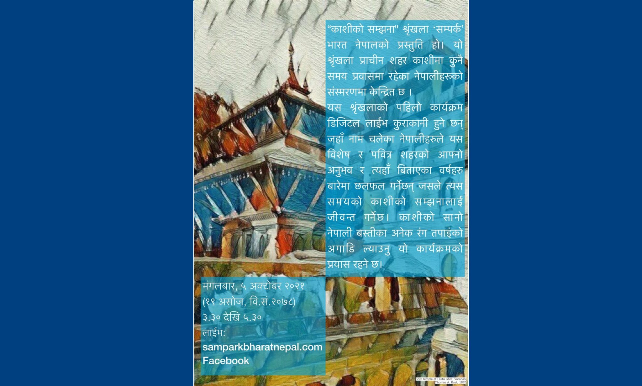 काठमाडौँ– ‘सम्पर्क भारत नेपाल’ले काशी-प्रवासमा रहेका नेपालीहरूको सम्झनामा ‘काशीको सम्झना’ कार्यक्रम गर्ने भएको…