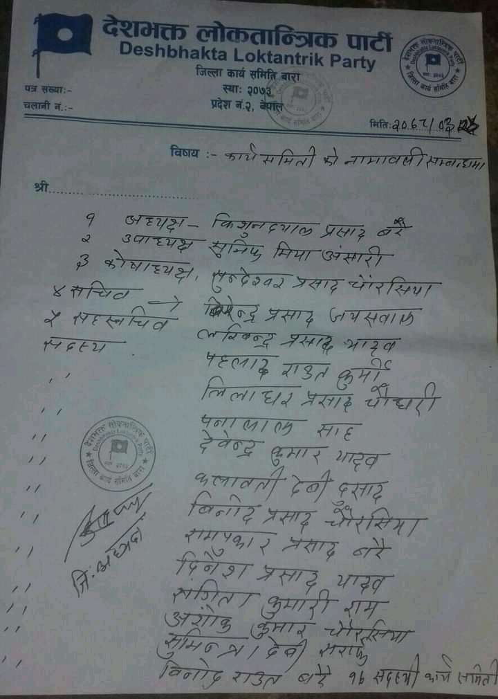 बाराको कलैयामा देशभक्त लोकतान्त्रिक पार्टीको जिल्ला कार्य समिति विस्तार