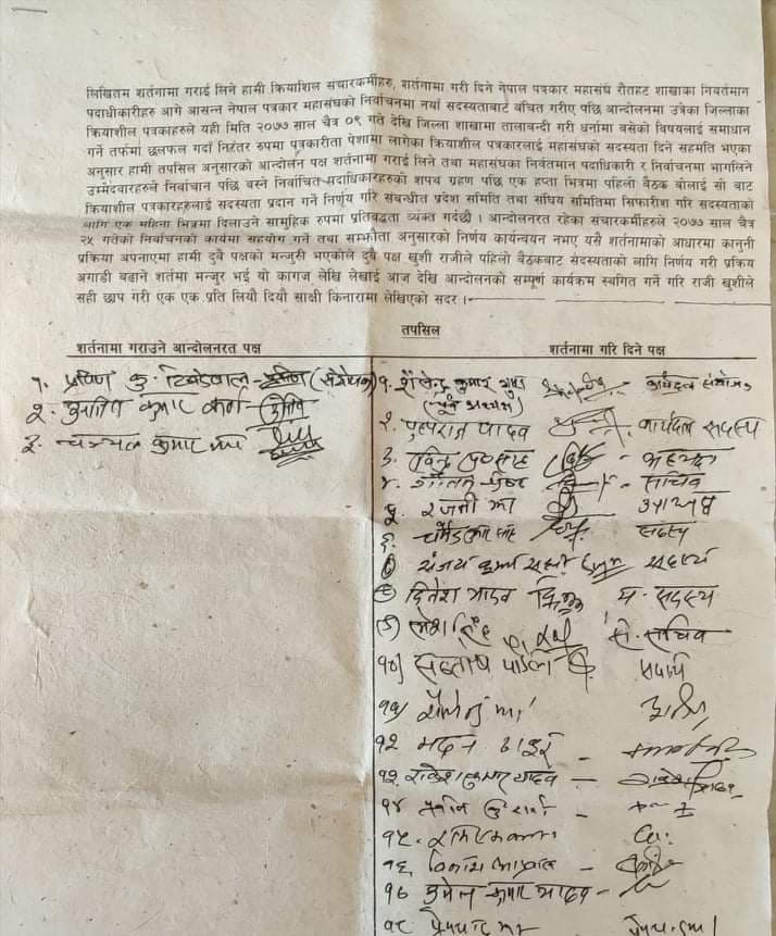 आन्दोलनरत समुह र पत्रकार महासंघबीच भएको सहमति पत्रमा पत्रकार महासंघको तर्फबाट महासंघका जिल्ला अध्यक्ष रवीन्द्र साह, पुर्व जिल्ला अध्यक्ष शैलेन्द्र गुप्ता, उपाध्या रजनी झा, सचिव गौतम श्रेष्ठ, सदस्य धर्मेन्द्र साह, दिनेश यादव, मदन ठाकुर, राकेश यादव लगाएतका पदाधिकारीहरुले हस्ताक्षर गरेका छन भने आन्दोलनरत क्रियाशील पत्रकारहरुको समुहबाट गठित संघर्ष समितिको तर्फबाट प्रवीन टिबडेवाल, चञ्चल झा र अजित कर्णले हस्ताक्षर गरेका छन ।