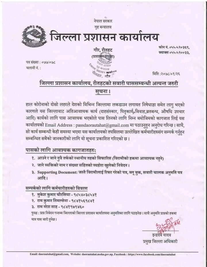 अति आवश्यक कार्यका लागि सवारी पास लिन जिल्ला प्रशासन कार्यालय रौतहटको आग्रह