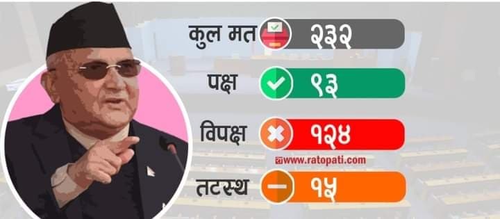 प्रतिनिधिसभामा विश्वासको मत गुमाएपछि प्रधानमन्त्री केपी शर्मा ओली पदमुक्त भएका छन् । प्रधानमन्त्री पदमुक्त भएसँगै कम्युनिष्ट पार्टीको सरकार ढलेको छ । प्रतिनिधिसभाबाट आवश्यक पर्ने विश्वासको मत नपाएपछि सोमबारदेखि प्रधानमन्त्री ओली स्वतः पदमुक्त बनेका हुन् । प्रधानमन्त्रीले प्रतिनिधिसभामा विश्वासको मत पुस्ट्याइँका लागि भएको मतदानमा हुन्छ भन्ने पक्षमा ९३ मत मात्रै पाए । प्रधानमन्त्रीको आफूप्रति विश्वास छ भन्ने प्रस्ताव पारित हुन हाल कायम रहेको २७१ सदस्यको बहुमत अर्थात् १३६ मत गर्न आवश्यक हुन्थ्यो । प्रधानमन्त्रीको प्रस्तावको विपक्षमा १२४ मत खसेको छ । सोमबार प्रतिनिधिसभामा भएको मतदानमा २३२ सांसदहरु सहभागी थिए । तीमध्ये १५ सांसदहरु तटस्थ बसेका थिए । एमालेको माधव नेपाल पक्षका सांसद अनुपस्थित रहे । त्यस्तै राप्रपा सांसद राजेन्द्र लिङ्देन पनि अनुपस्थित रहे । प्रधानमन्त्रीले आफूमाथि प्रतिनिधिसभाको विश्वास छ भन्ने स्पष्ट गर्न आवश्यक ठानेकाले सोही प्रयोजनका लागि राष्ट्रपति विद्यादेवी भण्डारीले सोमबारका लागि संसदको विशेष अधिवेशन बोलाएकी हुन् । मतदान प्रक्रियामा पीसीआर नेगेटिभ नतिजा भएकालाई मुख्य सभाकक्षमा मतदानको व्यवस्था मिलाइएको थियो भने पोजिटिभ संक्रमितलाई बेग्लै सुरक्षित र सुनिश्चित कक्षमा राखेर मतदान गर्ने प्रबन्ध मिलाइएको थियो । आजको अधिवेशनको प्रारम्भमै सभामुख अग्निप्रसाद सापकोटाले राष्ट्रपतिबाट प्रतिनिधिसभाको अधिवेशन आव्हानसम्बन्धी पत्र पढेर सुनाएका थिए । त्यसलगत्तै सभामुखका प्रस्तावमा बैठक सञ्चालन गर्ने सांसद सम्मिलित अध्यक्ष मण्डल बनाएर सभामुखले १५ मिनेट बैठक स्थगित गरे । अर्को चरणको बैठकमा प्रधानमन्त्री ओलीले विश्वासको मत लिने प्रस्ताव प्रस्तुत गरे। प्रस्ताव टेबल गरेसँगै प्रधानमन्त्रीले आफ्नो मन्तव्यसहित प्रस्तावका पक्षमा मतदान गर्न सभामा आग्रह गरे भने त्यसपछि प्रधानमन्त्रीको प्रस्तावमाथि केन्द्रित रही दलीय प्रतिनिधित्वका आधारमा सदस्यले आआफ्ना धारणा राखे । सांसदहरुको धारणा र उठाइएको प्रश्नमा प्रधानमन्त्री ओलीले जवाफ दिएसँगै मतदान अर्थात मत विभाजन सुरु भएको थियो । मत विभाजनका क्रममा हुन्छ, हुन्न र मत दिन्न भन्ने तीन मत जाहेर गर्ने व्यवस्था रहेको थियो । संवैधानिक व्यवस्थाअनुसार २७५ सदस्यीय प्रतिनिधिसभामा हाल २७१ सदस्य कायम छ । दल त्यागसम्बन्धी व्यवस्थाअनुसार नेकपा माओवादी केन्द्रले कारवाही गरेपछि मन्त्री टोपबहादुर रायमाझी, प्रभु साह, लेखराज भट्ट र गौरीशंकर चौधरीको स्थान रिक्त छ । सांसद विजयकुमार गच्छदार, मोहम्मद अफताब आलम, रेशम चौधरी र हरिनारायण चौधरी निलम्बनमा छन्, उनीहरुलाई मत ज