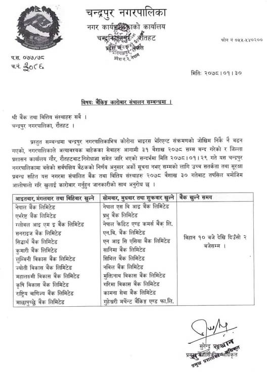 रौतहटको चन्द्रपुर नगर क्षेत्रका बैक तथा वित्तिय संस्थाहरुको कारोवार शुक्रबारबाट आलोपालो हुने भएको छ । कोरोना संकटका कारण नागरिकहरुको भिडभाड हुने गरेको जनाउदै भोलीबाट चन्द्रपुर नगर क्षेत्रका बैकहरुले आलोपालो कारोबार सञ्चालन गर्नु पर्ने चन्द्रपुर नगरपालिकाका प्रमुख प्रशासकिय अधिकृत सुरेन्द्र प्रधानले जानकारी दिनु भयो । चन्द्रपुर नगर क्षेत्रमा रहेका नेपाल बैक, एभरेष्ट बैक , ग्लोबल आइएमइ बैक , सनराइज बैक , सिद्धार्थ बैक , कुमारी बैक , लुम्बिनि बैक , ज्योती विकास बैक , महालक्ष्मि विकास बैक , कृषि बिकास बैक , राष्ट्रिय बाणिज्य बैक र माछापुच्छ«े ब्रक आइतबार , मंगलबार र विहिबार ३ दिन खुल्ने प्रधानले बताउनु भयो । त्यसैगरि एसविआइ बैक , प्रभु बैक , नेपाल क्रेडिट एण्ड कमर्स बैक , एनवि बैक , एनआइसि बैक , सानिमा बैक , सिभिल बैक , नबिन बैक , मसक्तिनाथ बैक ,गरिमा विकास बैक , कामना बैक र गुहेश्वरी मर्चेन्ट बैक सोमबार , बुधबार र शुक्रबार ३ दिन खुल्लाउन आलोपालो राखिएको चन्द्रपुर नगरपालिकाले जनाएको छ ।