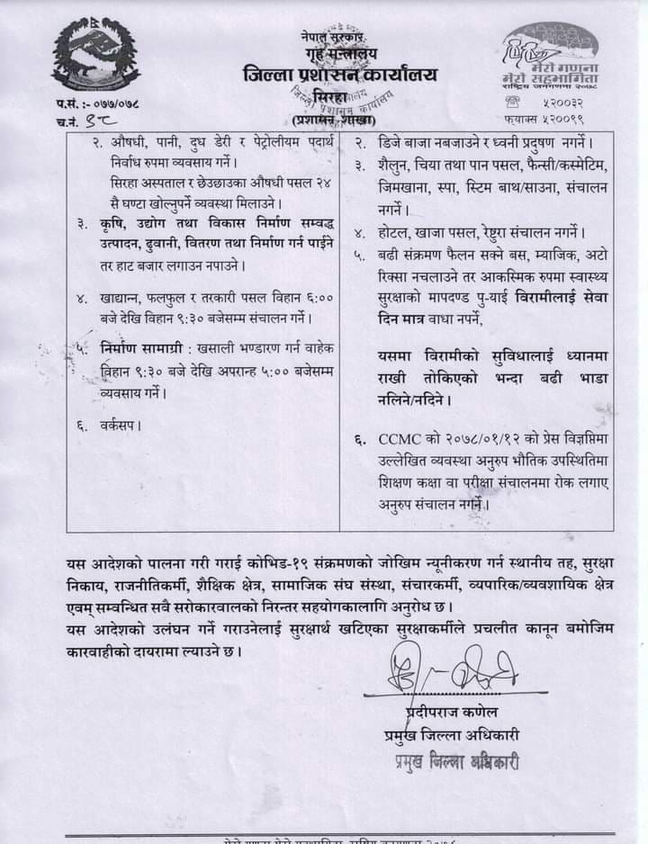 कोभिड–१९ संक्रमण न्यूनीकरण गर्न सिरहामा ३ हप्ताको लागि पुनः निषेधाज्ञा थप गरिएको छ ।