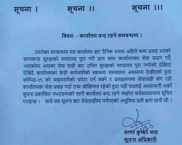 कोरोना संक्रमण बढ्दै गए पछि भूमिसुधार तथा मालपोत कार्यालय कलैयाले आफ्नो सम्पूर्ण सुवा बन्द गरेको छ । कार्यालयका सूचना अधिकारी सागर कुमार साहद्वारा हस्ताक्षर सुचनामा कर्मचारीको स्वास्थ्य समस्यामा असामान्य देखीएको साथै कोभिड –१९ को माहामारीको चपेटा पर्न सक्ने र प्रत्यक्षरुपमा सेवाग्राही संग रही सेवा प्रवाह गर्दा उच्च जोखिममा रहेको हुदा अर्को सूचना प्रकाशित नभए सम्म को लागि आफ्नो सम्पुर्ण सेवा बन्द गरेको बताएका छन् । हाल सम्म सुरक्षाको मापदण्ड पुरा गरी कार्यालयका सेवा प्रदान गर्दैआएको र हाल बढ्दो संक्रमणलाई मध्यनजर गर्दै सेवा लिन आएका सेवाग्राही बाट उचित सुरक्षाको मापदण्ड पुरा नभएको ले बन्द गर्नु परेको सूचना अधिकारी साह ले जानकारी दिएका छन् ।
