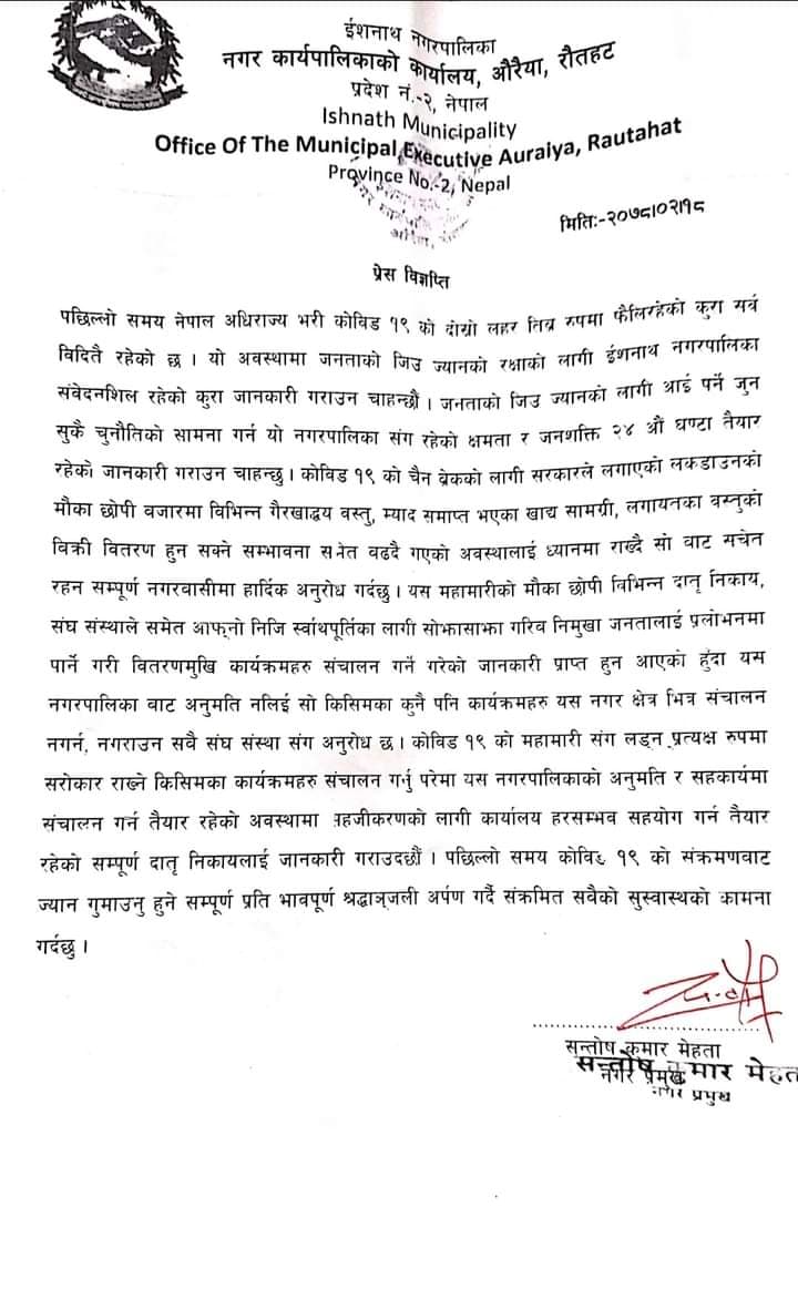 रौतहटको इशनाथ नगरपालिकाका नगर प्रमुख सन्तोष मेहताले नगरपालिकासँग अनुमति र सहकार्यका मात्र नागरिहरुसँग प्रत्यक्ष सरोकार राख्ने कार्य गर्न अपिल गर्नु भएको छ । कोरोना महामारीमा आम नागरिकहरुको जीवन रक्षा गर्न आफ्नो नगरपालिकामा विभिन्न दातृ संस्थाहरुले नगरपालिकाको अनुमति तथा सहकार्य बिना कुनै पनि कार्यक्रम नगर्न र नगराउन नगर प्रमुख सन्तोष मेहताले अनुरोध गर्नु भएको छ । महामारीको मौका छोपी विभिन्न दातृ निकाय , संघसंस्थाहरुले आफ्नो स्वार्थपुर्तिका लागी सोझासाझा गरिव निमुखा नागरिकहरुलाई प्रलोभनमा पारी वितरणमुखि कार्यक्रमहरु सञ्चालन गरेको आफुलाई जानकारी प्राप्त भएको जनाउनु हुदै त्यस्ता कार्यक्रमहरु नगरपालिकाको अनुमति वा सहकार्यमा मात्र गर्न नगर प्रमुख सन्तोष मेहताले दातृ संघसंस्थालाई अनुरोध गर्नु भएको छ । नगरपालिकाको अनुमति वा सहकार्य बिना त्यस्ता कार्यक्रम सञ्चालन गर्नमा रोक लगाइएको मेहताले बताउनु भयो । यो महासंकटको मौका छोपी बजारमा विभिन्न गैर खाद्यबस्तु , म्याद समाप्त भएका खाद्यान्नहरु विक्रिवितरण हुन सक्ने हुदा नगर क्षेत्रका नागरिहरुलाई सचेत रहन अपिल पनि गर्नु भएको छ ।