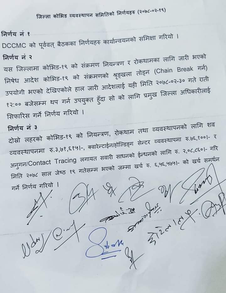 बैशाख १६ गते देखि जारी निषेधाज्ञालाई छैठो पटक लम्ब्याइएको हो । जिल्ला कोभिड १९ संकट व्यवस्थापन केन्द्र ९डिसिसिएमसी० को बुधवार बसेको बैठकले जेठ ३० गते राति १२ बजेसम्मका लागि निषेधाज्ञाको अवधि बढाएको हो ।