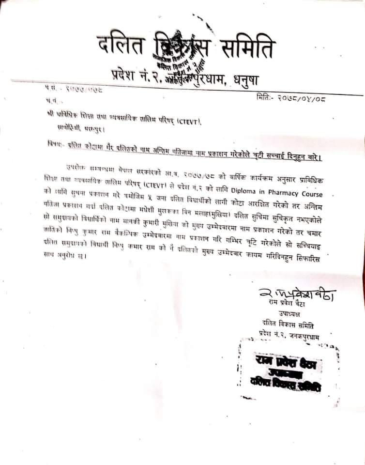 भक्तपुरको सानोठिमीस्थित प्राविधिक शिक्षा तथा व्यावसायिक तालिम परिषद् (सीटीईभीटी) ले डिप्लोमा इन फार्मेसी कोर्स अध्ययनका लागि उम्मेदवारको छनोट गर्दा दलित कोटामा गैरदलित विद्यार्थीको नाम राखेको पाइएको छ । सीटीईभीटीद्वारा गत असार ३० गते प्रकाशित अन्तिम नतिजामा दलित समुदायमा नपर्ने मधेसी मूलका बिन (मुखिया) जातिका रामलाल मुखियाकी छोरी मानकी कुमारीलाई मुख्य उम्मेदवारका रूपमा राखिएको हो। तर दलित समुदायमा सूचीकृत चमार जातिका अछेलाल रामका छोरा निप्पुकुमार रामलाई चाहिँ वैकल्पिक उम्मेदवारमा उल्लेख गरिएको छ । सर्लाहीको मलंगवा नगरपालिका वडा नम्बर ४ निवासी निप्पुकुमार रामले यस विषयमा उजुरी गरेपछि राष्ट्रिय दलित अयोगले नतिजा सूची सच्याउन सीटीईभीटीलाई पत्राचार गरिसकेको छ। दलित उम्मेदवार निप्पुकुमार रामले यस विषयमा पहल गरिदिन अनुरोध गर्दै आफ्नै जिल्लास्थित नेपाल राष्ट्रिय दलित समाज कल्याण संघमा उजुरी दिएका थिए। त्यसपछि आफूले राष्ट्रिय दलित अयोगमा जानकारी गराएको र आयोगले सीटीईभीटीको कार्यालयमा पत्राचार गरेको संघका अध्यक्ष राजेश पासवानले जानकारी दिए। राष्ट्रिय दलित आयोगले सीटीईभीटीलाई शुक्रबार पत्र पठाउँदै ‘मधेसी मूलका बिन मुखिया राष्ट्रिय दलित आयोगको दलित सूचीमा नरहेकाले नतिजा प्रकाशनमा गम्भीर त्रुटि हुन गएको हुँदा मानकी कुमारीको नाम कट्टा गरी निप्पुकुमार रामको नाम दलित कोटामा कायम गर्न’ भनेको हो। यस्तै प्रदेश न २ स्थित दलित विकास समितिका उपाध्यक्ष रामप्रवेश बैठाले पनि यो त्रुटि सच्याउन माग गर्दै शुक्रबार सीटीईभीटी (भक्तपुर) मा पत्र पठाएका छन्। नेपाल राष्ट्रिय दलित समाज कल्याण संघ (सर्लाही) का अध्यक्ष पासवानका अनुसार डिप्लोमा इन फार्मेसी अध्ययनका लागि सीटीईभीटीले प्रदेश २ का दलित विद्यार्थीका लागि ५ वटा कोटा छुट्याएको थियो। तर त्यसको उम्मेदवार सूची प्रकाशन गर्दा एक दलित कोटामा गैरदलितको नाम समावेश गरेको हो । यसबारे जानकारी आएपछि आफूहरूले त्रुटि सच्याउन पहल गरिरहेको र सीटीईभीटीले नसच्याए सर्वाेच्च अदालतमा मुद्दा हालिने पासवानले बताए ।