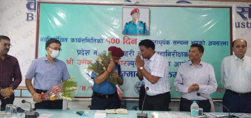 वीरगंज उद्योग वाणिज्य संघका नवनिर्वाचित पदाधिकारी तथा कार्यसमितिले आफ्नो कार्यकालको १०० दिन पूरा गरेको अवसरमा डिआइजी रञ्जिकारसँग भेटघाट र सरसल्लाह गरेका हुन्। भेटको क्रममा संघका अध्यक्ष सुबोधकुमार गुप्ताले हाल कायम रहेको शान्ति सुव्यवस्थालाई स्थायित्वको लागि आग्रह गरे । उनले कोभिड १९ को सम्भावित तेस्रो लहरलाई मध्यनजर गर्दै सङ्घले आफ्नो सक्रियतामा नारायणी अस्पतालमा बाल सघन चिकित्सा इकाईको निर्माण सम्पन्न गरेको र हाल उक्त इकाईबाट प्रभावकारी स्वास्थ्य सेवा प्रदान भई रहेको जानकारी गराए । वीरगञ्ज उद्योग वाणिज्य सङ्घका अध्यक्ष सुबोधकुमार गुप्ताको अध्यक्षतामा प्रदेश नम्बर २ का प्रहरी नायब महानिरीक्षक उमेश रञ्जितकार संग सङ्घकै सभाकक्षमा भेटघाट तथा अन्तरक्रिया कार्यक्रम गरेको छ । कार्यक्रममा नेपाल उद्योग वाणिज्य महासङ्घ प्रदेश नम्बर २ का अध्यक्ष गणेशप्रसाद लाठ, सङ्घका पूर्वअध्यक्ष अशोककुमार बैध, सङ्घका वरिष्ठ उपाध्यक्ष अनिलकुमार अग्रवाल, उपाध्यक्षद्वय हरि गौतम, माधव राजपाल, महासचिव मनोजकुमार दास, सह–कोषाध्यक्ष श्री प्रेमचन्द्र गोयल, सह–सचिव अनोज रुँगटा, कार्यसमिति सदस्य शिवजी प्रसाद साह, सुरेशकुमार रुँगटा, निरज अग्रवाल, प्रकाश खण्डेलवाल, अवधेशकुमार सरावगीजको उपस्थिती रहेको थियो ।
