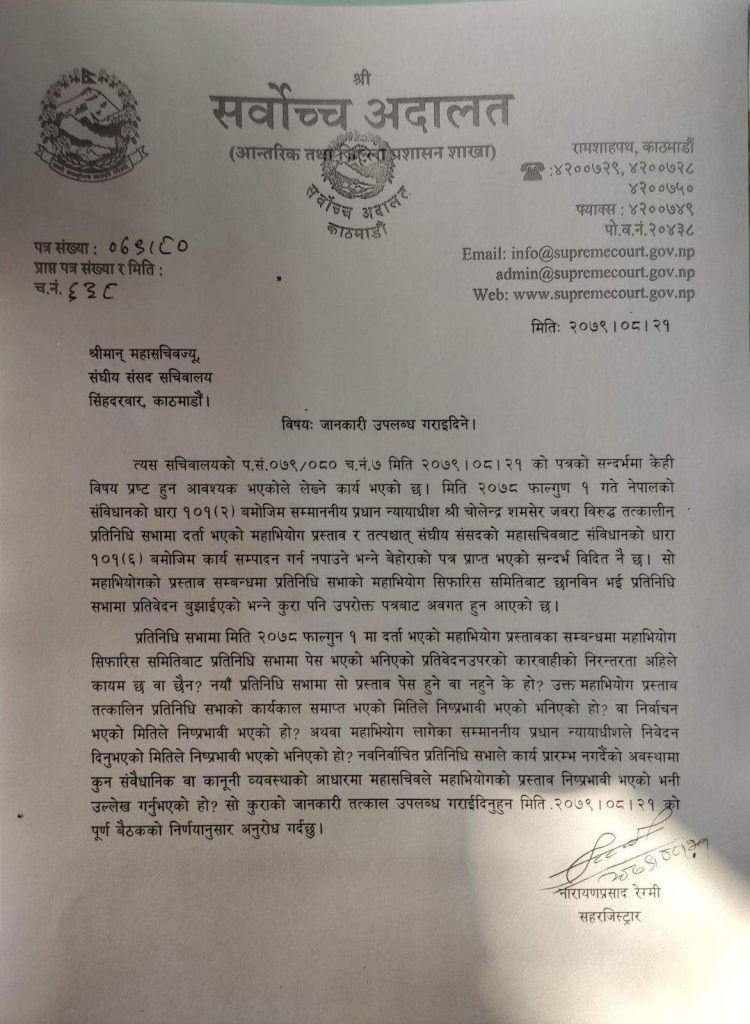 ‘२०७८ फागुन १ मा दर्ता भएको महाअभियोग प्रस्तावका सम्बन्धमा महाअभियोग सिफारिस समितिबाट प्रतिनिधिसभामा पेश भएको भनिएको प्रतिवेदन उपरको कारबाहीको निरन्तरता अहिले कायम छ वा छैन ?’ पत्रमा भनिएको छ, ‘नयाँ प्रतिनिधिसभामा सो प्रस्ताव पेश हुन्छ वा हुन्न? महाअभियोग प्रस्ताव तत्कालीन प्रतिनिधिसभाको कार्यकाल सम्माप्त भएको मितिले निष्प्रभावी भएको हो ? वा निर्वाचनको मितिले ? नवनिर्वाचित प्रतिनिधिसभाले कार्य प्रारम्भ नगर्दैको अवस्थामा कुन संवैधानिक वा कानुनी व्यवस्थाको आधारमा महासचिवले महाअभियोग निष्प्रभावी भएको भनि उल्लेख गर्नु भएको हो ?