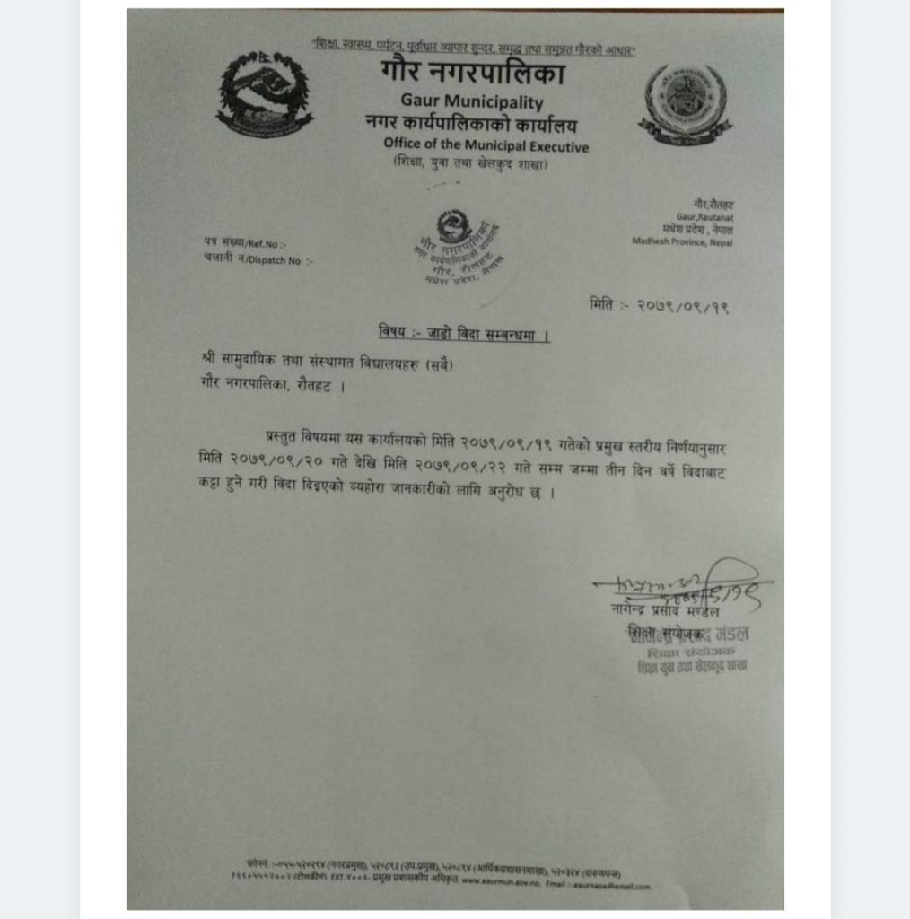 रौतहटमा चिसो बढेपछि गौर नगरपालिकाले बुधवार देखि शुक्रवार (तीन दिन) नगरभित्र रहेका सम्पूर्ण सामुदायिक विद्यालय बन्द गर्ने निर्णय गरेको छ ।