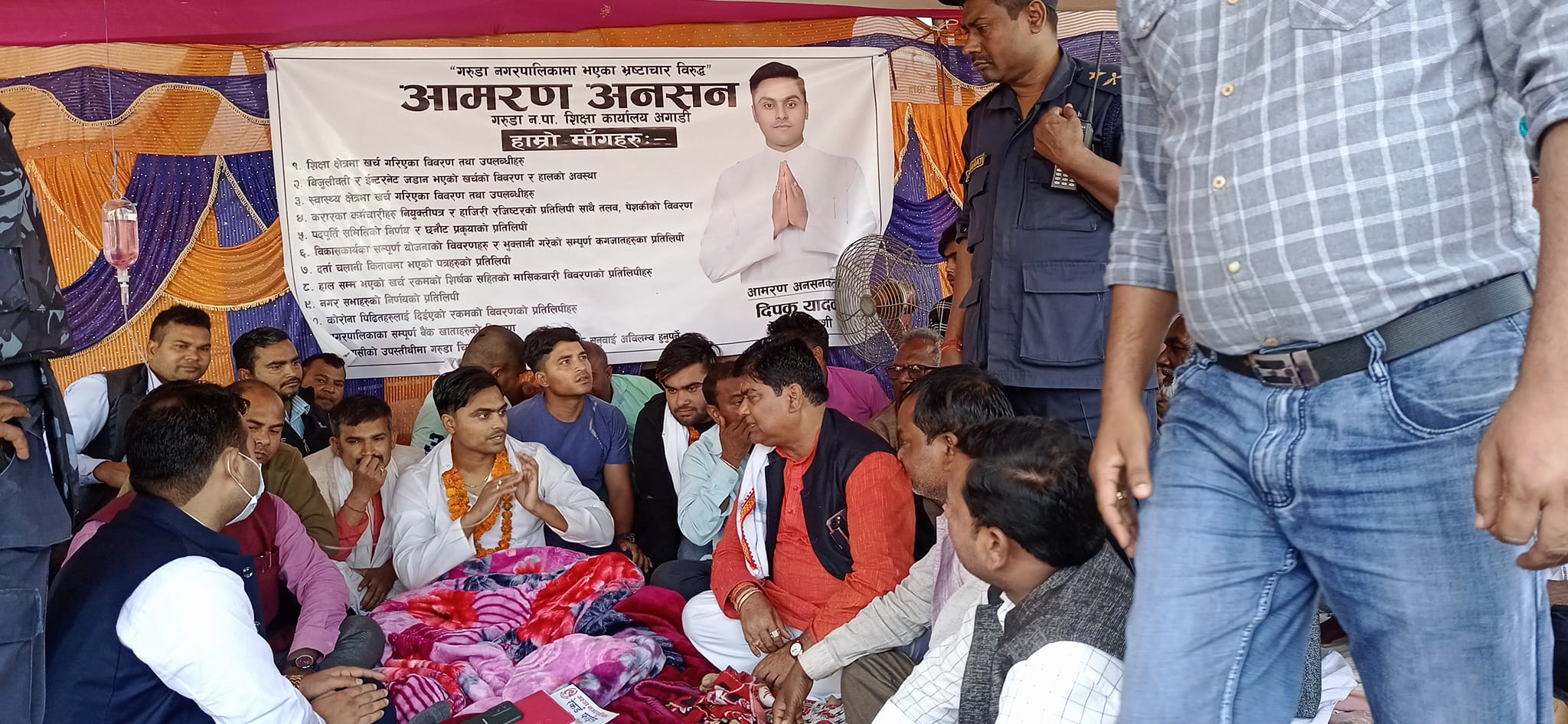 रौतहट,०८ चैत्र। रौतहटको गरुडा नगरपालिकाको मेयर पदका प्रत्याशी दीपक यादवले १४ सूत्रीय माग अघि सार्दै तीन दिनअघि सुरु गरेको आमरण अनसन जारी छ । नगरपालिकाका मेयर कन्थमनी जैसवाल र प्रमुख प्रशासकीय अधिकृत भुदेव झाले मंगलबार उनलाई भेटेरै माग पूरा गर्ने प्रतिबद्धता जनाए पनि यादवले अनशन जारी राखेका हुन् ।