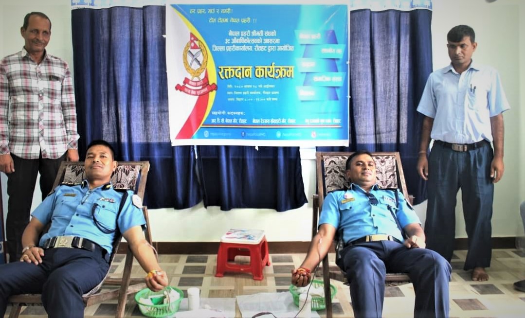 रौतहट,२८ साउन। रौतहटको गौरमा नेपाल प्रहरी श्रीमति संघको ३९ औं वार्षिक उत्सवको अवसरमा जिल्ला प्रहरी कार्यालय रौतहटद्वारा आयोजित रक्तदान कार्यक्रम नवनिर्मित भवनको सभाहलमा आज रक्तदान कार्यक्रम सम्पन्न भएको छ । उक्त रक्तदान कार्यक्रममा लगभग ८० जनाले रक्तदान गरेका हुन् ।