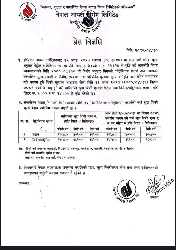 मंगलबार राति बसेको निगम सञ्चालक समिति बैठकले डिजल र मट्टीतेलमा प्रतिलिटर १४ र पेट्रोल लिटरमा ५ रुपैयाँले बढाएर मूल्य समायोजन गरेकाे निगम स्रोतले जानकारी दिएको छ ।