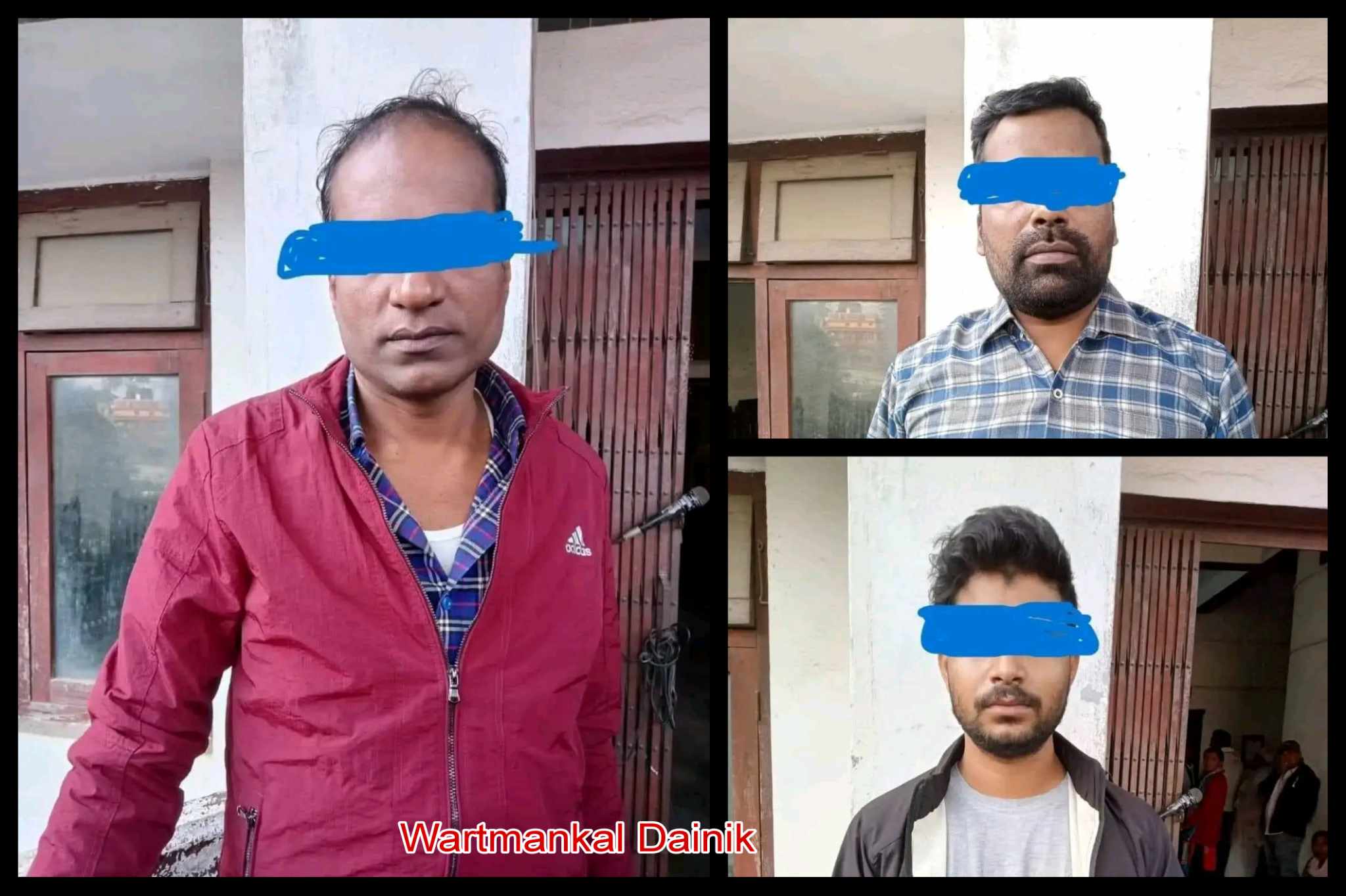 गौर नगरपालीका वडा नं. ४ वस्ने वर्ष २५ को जितेन्द्र गिरी ,वडा नं. ७ बस्ने वर्ष ३७ को दिपेन्द्र कुमार साह , गुजरा नगरपालीका बडा न.६ घर भई हाल चन्द्रपुर नगरपालीका वडा नं.१० बस्ने बर्ष ४२ को राज कुमार साहलाई पक्राउ गरेको जिल्ला प्रहरी कार्यालय रौतहटले जानकारी दिएका छन् ।