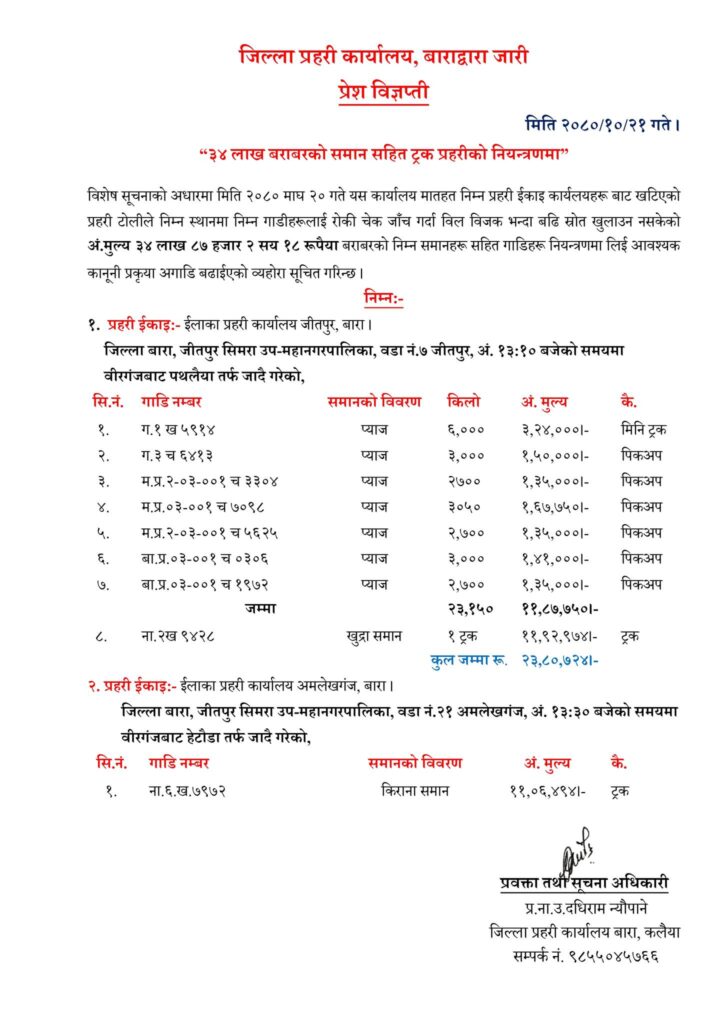 बारा, २१ माघ। जिल्ला प्रहरी कार्यालय बाराले ३४ लाख रुपैयाँ बराबरको प्याज र खुद्रा सामान नियन्त्रणमा लिएको छ ।