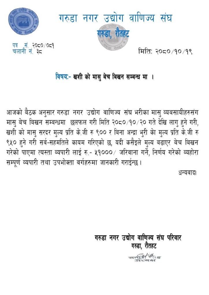 आन्द्रा भुँडी समेतको प्रतिकिलो खसीको ताजा मासु प्रतिकिलो ९०० रुपैयाँ र आन्द्रा भुँडी नभएको मासु प्रतिकिलो ९५० को दरले बिक्री गर्नु पर्ने निर्णय भएको छ। निर्धारित दरभन्दा बढी भाउमा बिक्री वितरण गर्ने व्यवसायीलाई ५१ हजार रुपैयाँ जरिवाना गरिने उद्योग वाणिज्य संघ गरुडाका अध्यक्ष सतीश कुमार साहद्वारा जारी विज्ञप्तिमा उल्लेख गरिएको छ।