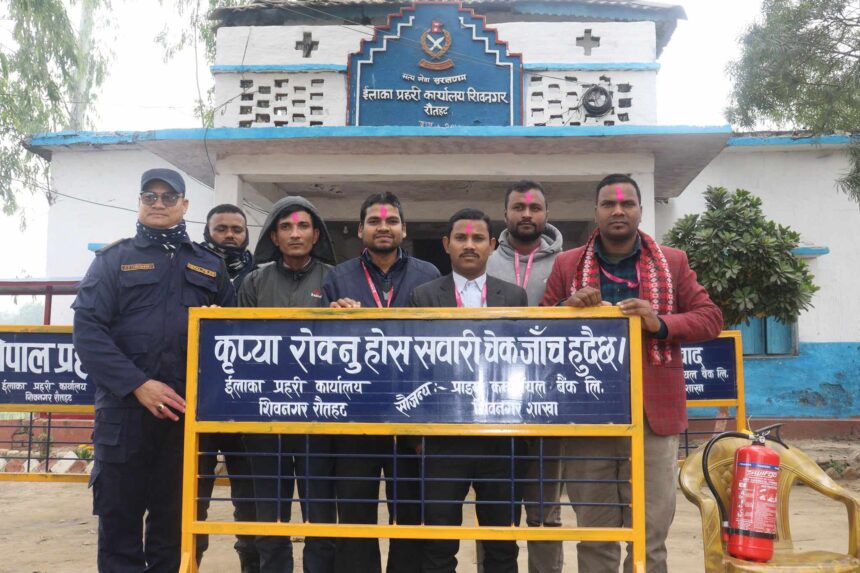 माघ २४, रौतहट । प्राईम कमर्सियल बैंक लिमिटेड शाखा शिवनगरद्वारा मंगलबार ईलाका प्रहरी कार्यालय रौतहट शिवनगरमा ३ थान‘सवारी चेक जाँच हुदैं छ ’ लेखेको बोर्ड ईलाका प्रहरी कार्यालय शिवनगरलाई हस्तान्तरण गरेको हो ।