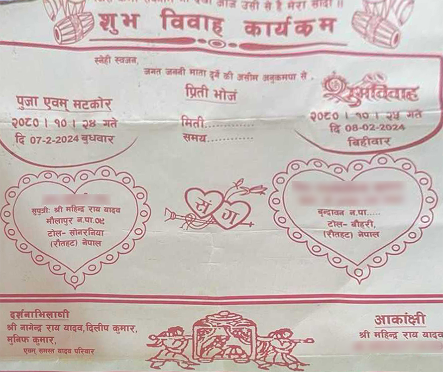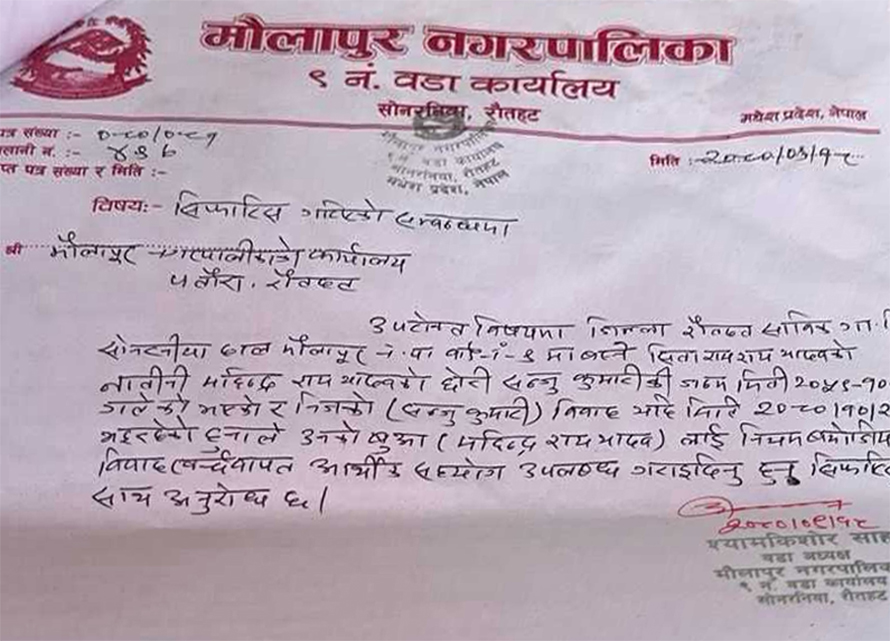 रौतहटको मौलापुरमा छोरीको विवाह भन्दै नक्कली निम्तो कार्ड छपाएर एकजनाले नगरपालिका कार्यालयबाट आर्थिक सहयोग लिन खोजेको खुलेको छ ।मौलापुर नगरपालिका–९ सोनखियाका महिन्द्र राय यादवले छोरीको बिहे भन्दै नगरपालिकाबाट ३० हजार रुपैयाँ आर्थिक सहायता लिन खोजेका हुन् ।मेयर रीना साहका अनुसार महिन्द्रले बिहीबार (२५ माघ)छोरीको बिहे रहेको भन्दै निमन्त्रणा कार्ड छपाएका थिए । त्यही कार्डको आधारमा वडा नं. ९ का वडाध्यक्ष श्यामकिशोर साहले उनलाई आर्थिक सहयोग गरिदिन सिफारिस गरेका थिए ।