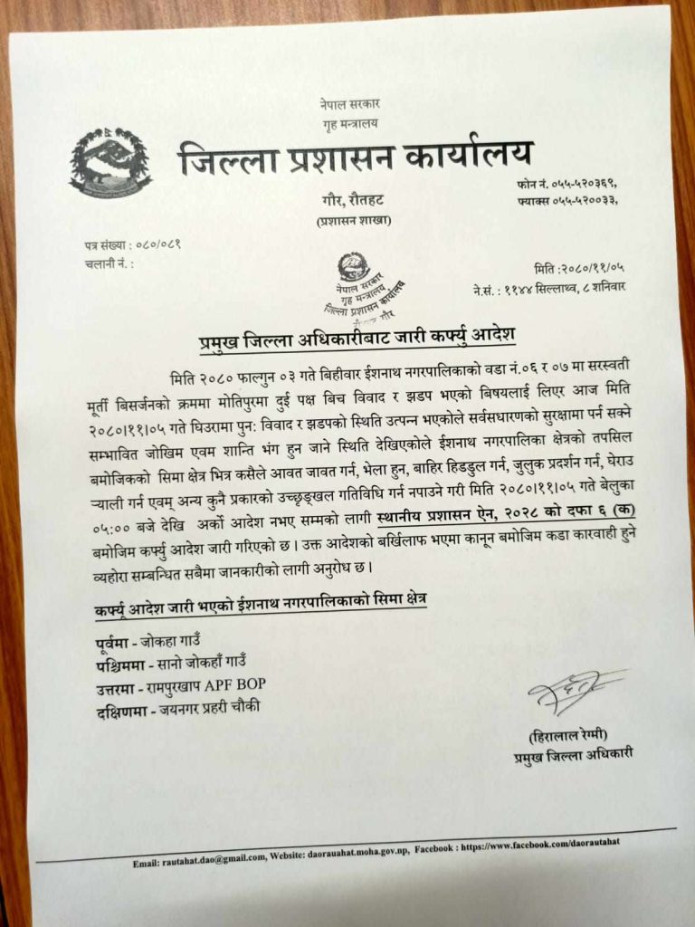 राैतहटका प्रमुख जिल्ला अधिकारी हिरालाल रेग्मीले दुई पक्षबीच झडपको अवस्था सिर्जना भएपछि स्थिति नियन्त्रणमा लिन कर्फ्यू आदेश जारी गरिएको बताए । उनकाअनुसार पूर्वमा जोकाहा गाउँ, पश्चिममा घिउरा, उत्तरमा रामपुरखाप र दक्षिणमा जयनगरसम्मको क्षेत्रमा अनिश्चितकालसम्मको लागि कर्फ्यू आदेश जारी गरिएको छ ।
