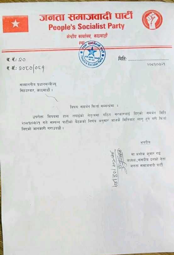 काठमाडौँ, २१ असार। जनता समाजवादी पार्टी (जसपा)ले सरकारलाई दिएको समर्थन फिर्ता लिएको छ । शुक्रबार बसेको जसपाको बैठकलाई प्रधानमन्त्री पुष्पकमल दाहाल ‘प्रचण्ड’लाई दिएको समर्थन फिर्ता लिने निर्णय गरेको हो ।