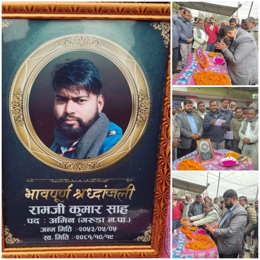 रौतहटको गरुडा नगरपालिकाका कर्मठ, इमानदार र जिम्मेवार अमिन रामजी साहको असामयिक निधनले सिंगो नगरपालिका नै स्तब्ध भएको छ । नगरपालिकाको प्रशासनिक कामकाजमा महत्त्वपूर्ण भूमिका निर्वाह गर्दै आएका साहको शनिबार निधन भएको हो । उहाँको अचानक निधनले सम्पूर्ण नगर परिवार गहिरो शोकमा डुबेको छ । आइतबार गरुडा नगरपालिकाको तर्फबाट श्रद्धाञ्जली सभा आयोजना गरी नगर प्रमुख कन्थमनी प्रसाद जैसवालले श्रद्धाञ्जली अर्पण गर्नुभयो ।