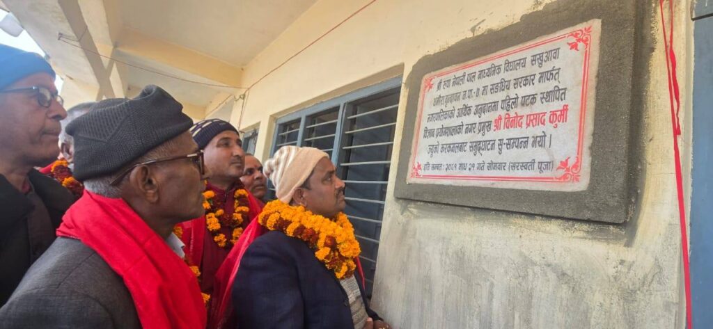 नगर प्रमुख कुर्मिले उक्त बिधालयको शौचालय निर्माणका लागी २० लाख रुपैंया दिने सोहि मन्चबाट घोषणा समेत गर्नु भएको थियो त्यति मात्र नभएर सोहि बिधालय स्थित रहेको अधुरा भवनको पलास्टर,झयाल ढोका लगायत रंगरोदन गर्नको लागी २५ लाख रुपैया सहयोग गर्ने बताउनु भइको थियो ।