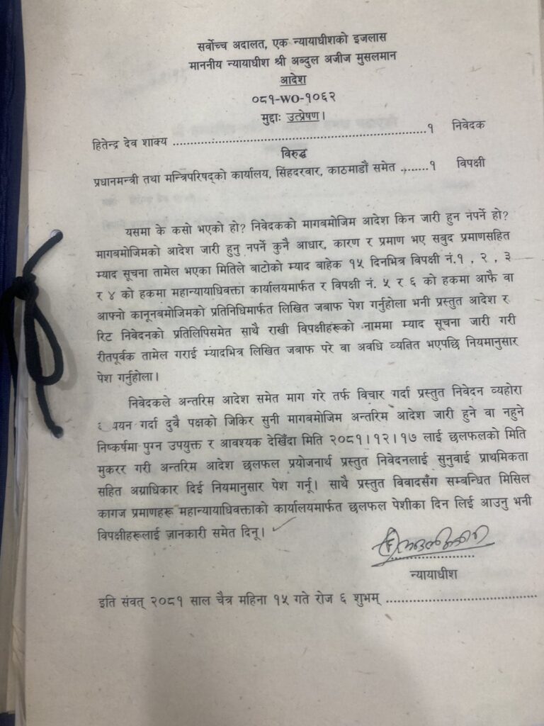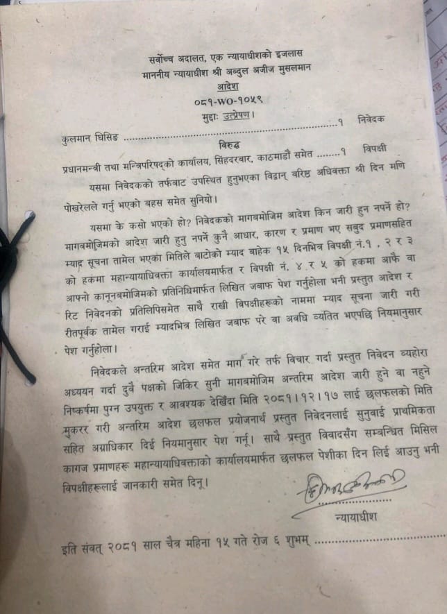 न्यायाधीश अब्दुल अजिज मुसलमानको इजलासले शुक्रबार प्रारम्भिक सुनुवाइ गर्दै सरकारका तर्फबाट आवश्यक कागजातसहित लिखित जवाफ पेश गर्न निर्देशन दिएको हो। सर्वोच्चमा कुलमान घिसिङ र हितेन्द्रदेव शाक्यले सरकारको निर्णयविरुद्ध छुट्टाछुट्टै रिट दायर गरेका थिए।