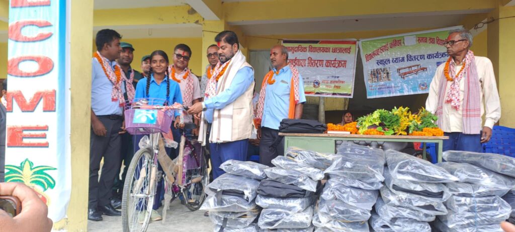 गरुडा नगरपालिकाका नगर प्रमुख कन्थमनी प्रसाद जैसवालले नगरभित्र रहेका गरिब, दलित तथा पछाडि परेका वर्गका छात्राहरुको शैक्षिक स्तर उकास्न विभिन्न सामाजिक तथा शैक्षिक कार्यक्रमहरु निरन्तर सञ्चालन गर्दै आउनु भएको छ । यसै क्रममा नगर प्रमुख जैसवालले बुधबार गरुडा नगरपालिका–८ मा अवस्थित श्री रामचन्द्र माध्यमिक विद्यालयमा अध्ययनरत छात्राहरुलाई साइकल तथा ब्याग वितरण गर्नुभयो ।
