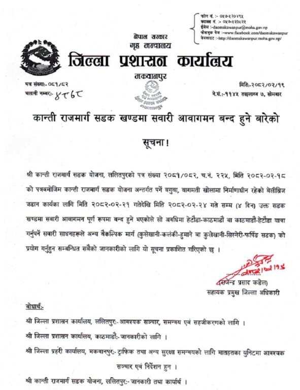 जिल्ला प्रशासन कार्यालय मकवानपुरले सूचना निकालेर मंगलबार जेठ २१ गतेदेखि जेठ २४ गतेसम्म सडक पूर्णरुपमा बन्द हुने जानकारी दिएको छ । सूचनमा सडक बन्द हुँदा हेटौँडा–काठमाडौँ र काठमाडौँ–हेटौँडा चल्ने गाडीलाई वैकल्पिक सडक प्रयोग गर्न आग्रह गरिएको छ ।