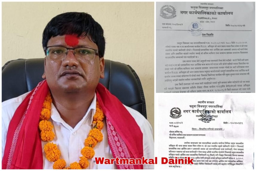 जिल्ला समन्वय समिति गौर रौतहटमा कार्यरत अधिकृत छैठौंतहका वकिल पालले नक्कली पत्र र नगरप्रमुखको हस्ताक्षर किर्ते गरी प्रमुख प्रशासकीय अधिकृतको जिम्मेवारी प्राप्त गर्ने खोजेको रहस्य खुलेको हो । फतुवा बिजयपुर नगरपालिकाको प.स. २०८१/०८२ च.नं. २७०० मिति २०८२/०२/१९ गतेको पत्रमा फतुवा बिजयपुर न.पा.कार्यालयमा कार्यरत नि.प्र.प्र. अधिकृत श्री भरत प्रसाद यादव विना संकेत नं.को तथा स्थानीय तहको कर्मचारी रहेको र उनलाई प्रशासनिक तथा आर्थिक ज्ञान क्षमताको अभाव भई कार्य सेवा प्रवाह अति प्रभावित भएको व्यहोरा जनाई संघिय मामिला तथा सामान्य प्रशासन मन्त्रालय सिंहदरबार काठमाडौँमा सरुवाको पत्र पठाईएको र उक्त सरुवा पत्रमा मेरो कार्यवाहक नगर प्रमुख अम्बेया खातुनको अनुमती तथा जानकारी विना जाली किर्ते सही छाप गरी गराई न.पा.को प्रशासनिक तथा आर्थिक काम काज गर्न गराउन भनि जिल्ला समन्वय समिति गौरमा कार्यरत वकिल पालको नाममा सिफारिस पत्र तयार पारी संघिय मामिला तथा सामान्य प्रशासन मन्त्रालयमा पत्रचार गरेको तर यश फतुवा बिजयपुर पालिकामा हाल कार्यरत नि.प्र.प्र. अधिकृत श्री भरत प्रसाद यादवले कार्यालयको सम्पूर्ण प्रशासनिक तथा आर्थिक कार्य सन्तोष जनक रुपमा संचालन भै रहेको तथा विकास निर्माणका कार्यहरु पनि चुस्त-दुरुस्त रुपमा संचालन गर्दै आईरहनु भएको हुँदा हुदै कार्यवाहक नगर प्रमुख अम्बेया खातुनको किर्ते हस्ताक्षर गरी तयार पारी संघिय मामिला तथा सामान्य प्रशासन मन्त्रालयमा पठाईएको पत्रको कुनै सत्यता समेत नरहेको भन्दै जिल्ला समन्वय समिति रौतहट गौरमा कार्यरत रा.प.तृतीय श्रेणी(संघ)को शाखा अधिकृत कर्मचारी प्रशासन सेवाका वकिल प्रसाद पाल (क.सं.नं. १८३४०९) ले किर्ते हस्ताक्षर गरी तयार पारी पठाईएको पत्रको कुनै सत्यता समेत नभई किर्ते सिफारिस रहेकोले सो पत्र तयार गर्ने गराउने र यसमा संलग्न जो सुकैलाई सुक्षम अनुसन्धान गरी कानुनी कार्यवाही गर्नु हुन सम्बन्धित सबै निकायमा जानकारी गराइएको कार्यवाहक नगरप्रमुख अम्बेया खातुन द्वारा हस्ताक्षरित प्रेस विज्ञप्तिमा उल्लेख रहेको छ।