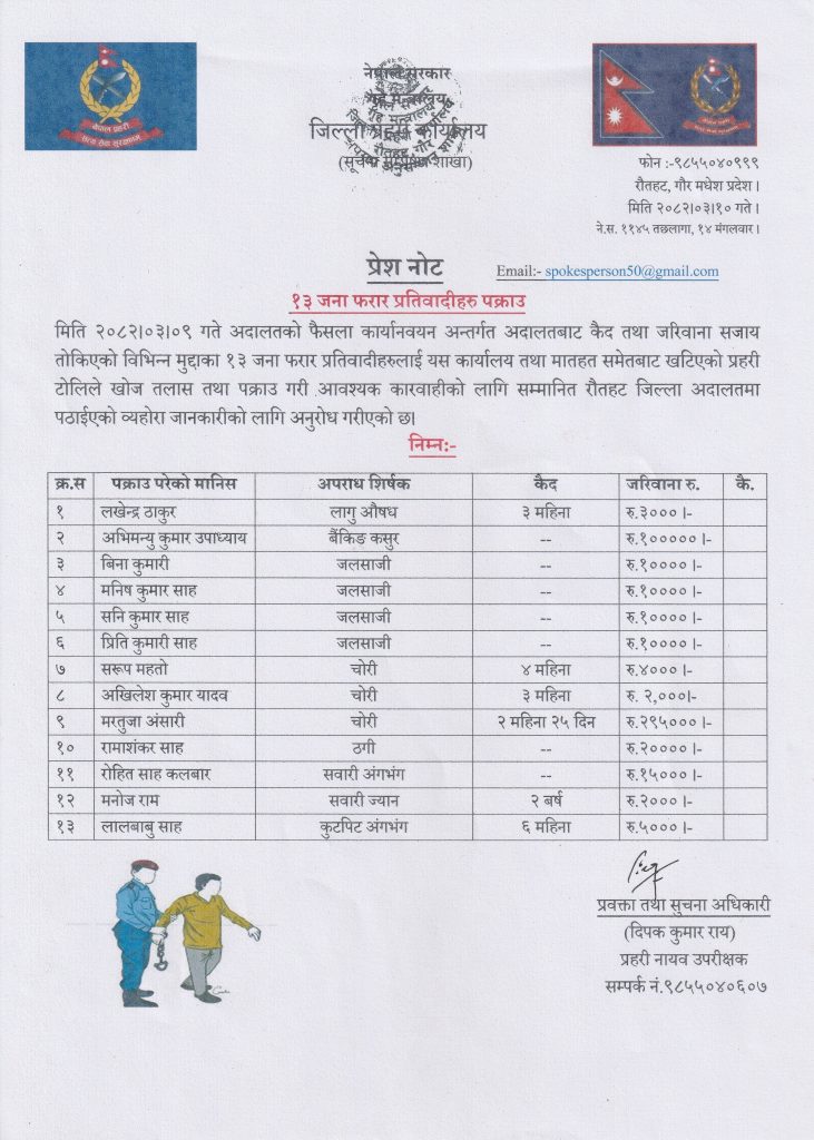 लामो समयदेखि फरार रहेका उनीहरूलाई जिल्लाका विभिन्न स्थानबाट पक्राउ गरी आवश्यक कारबाहीका लागि रौतहट जिल्ला अदालतमा बुझाइएको छ। पक्राउ पर्नेहरूमा ३ महिनादेखि २ वर्षसम्म कैद सजाय र रु. २,००० देखि रु. १,००,००० सम्म जरिवाना तोकिएका व्यक्तिहरू छन्।