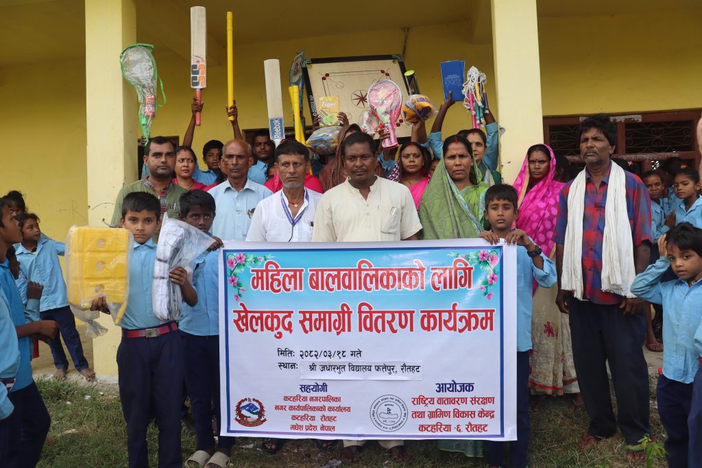 बुधबार एक विशेष समारोहको आयोजना गरी नगर उपप्रमुख रिता देवी यादव र राष्ट्रिय वातावरण संरक्षण तथा ग्रामीण विकास केन्द्र, कटहरिया–फत्तेपुरका अध्यक्ष रौशन कुमार चौधरीले संयुक्त रूपमा विद्यालयका प्रतिनिधिहरूलाई सामग्रीहरू हस्तान्तरण गरेका हुन् । यस कार्यक्रममा चेसबोर्ड, लुडो, स्किपिङ डोरी, क्यारमबोर्ड, भलिबल, फुटबल, ब्याटमिन्टन सेट, क्रिकेटको ब्याट तथा बल जस्ता सामग्रीहरू विद्यालयहरूलाई प्रदान गरिएको थियो ।