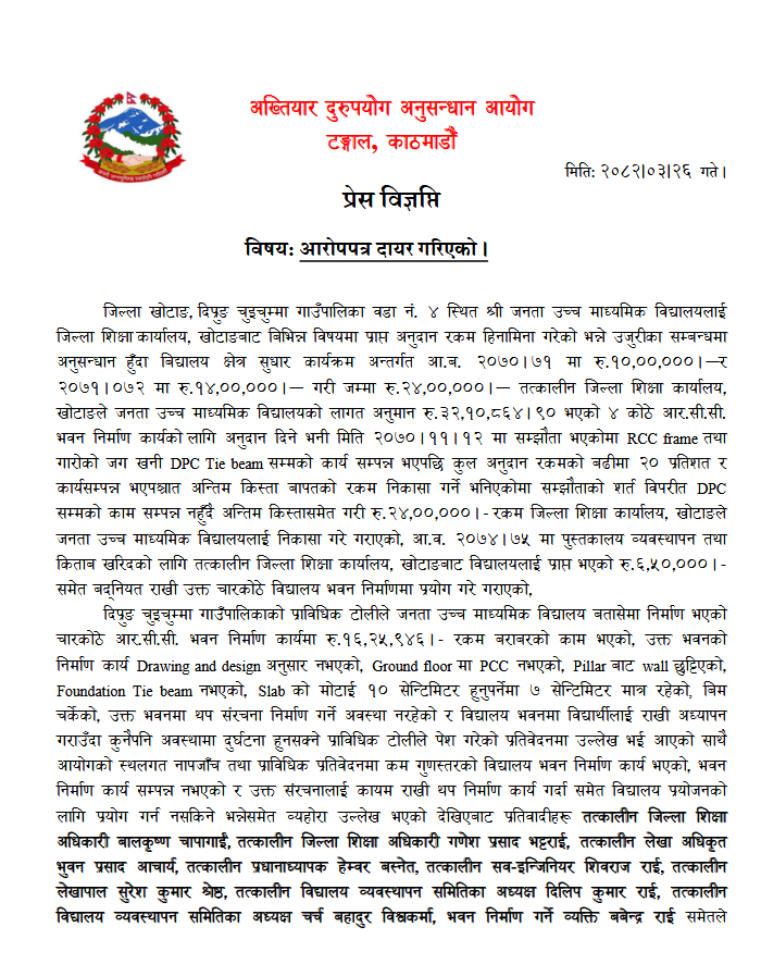 काठमाडौँ,२६ असार। अख्तियार दुरुपयोग अनुसन्धान आयोगले जिल्ला शिक्षा अधिकारीसहित नौँ जनाविरुद्ध भ्रष्टाचार मुद्धा दायर गरेको छ ।