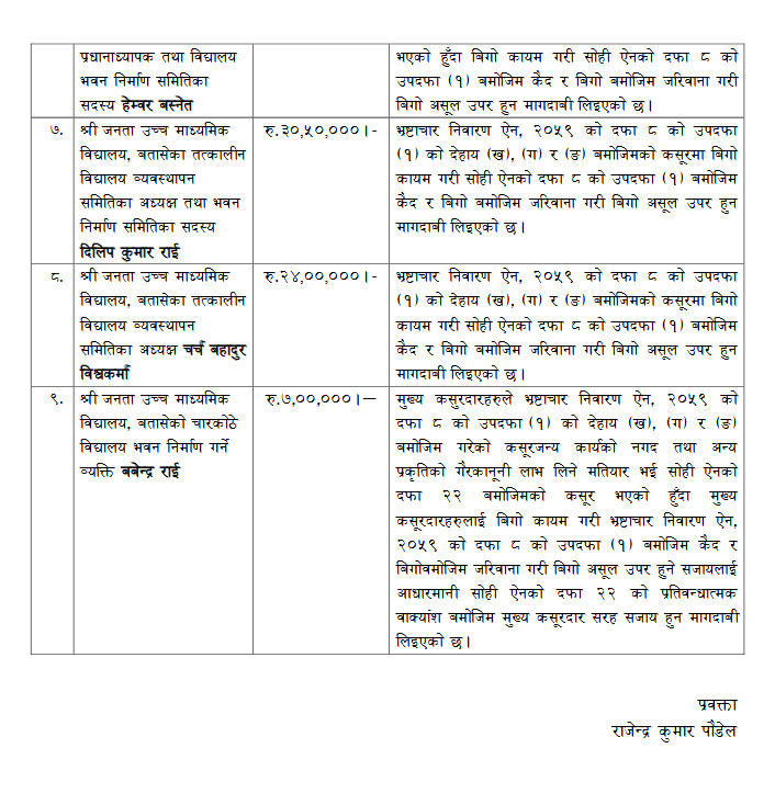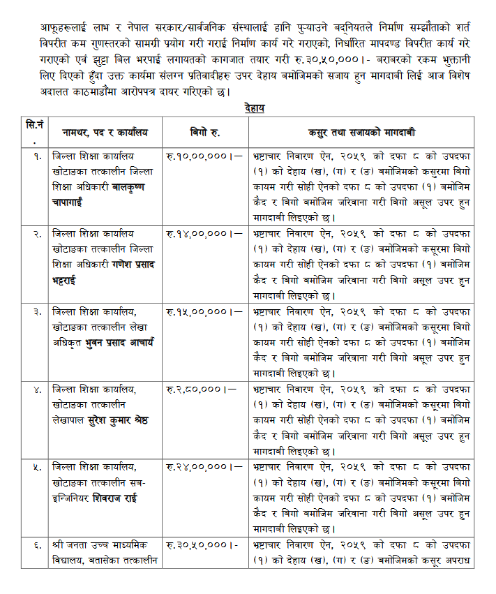 बिहीबार आयोगले जिल्ला शिक्षा कार्यालय, खोटाङका तत्कालीन जिल्ला शिक्षा अधिकारी बालकृष्ण चापागाईं, गणेश प्रसाद भट्टराईसहित नौँ जना उपर गैर कानुनी लाभ तथा हानी पुर्याई भ्रष्टाचार गरेको आरोपमा मुद्धा दायर गरेको हो ।
