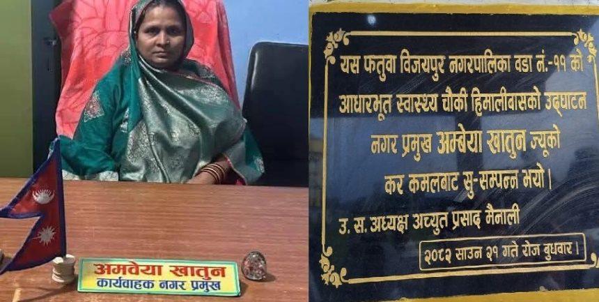 रौतहट, २२ श्रावण। रौतहटको फतुवा विजयपुर नगरपालिकामा कार्यवाहक नगर प्रमुख अम्बेया खातुनको नाममा सार्वजनिक संरचनामा ‘नगर प्रमुख’ लेखिएपछि विवाद उत्पन्न भएको छ ।