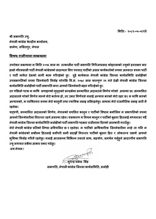 सिंहले पार्टी सभापति शेरबहादुर देउवालाई सम्बोधन गर्दै नेपाली काँग्रेस केन्द्रीय कार्यालय सानेपामा पठाएको राजीनामा पत्रमा अदालतको फैसलापछि जिम्मेवारीमा बसिरहन नमिल्ने उल्लेख गरेका छन् ।