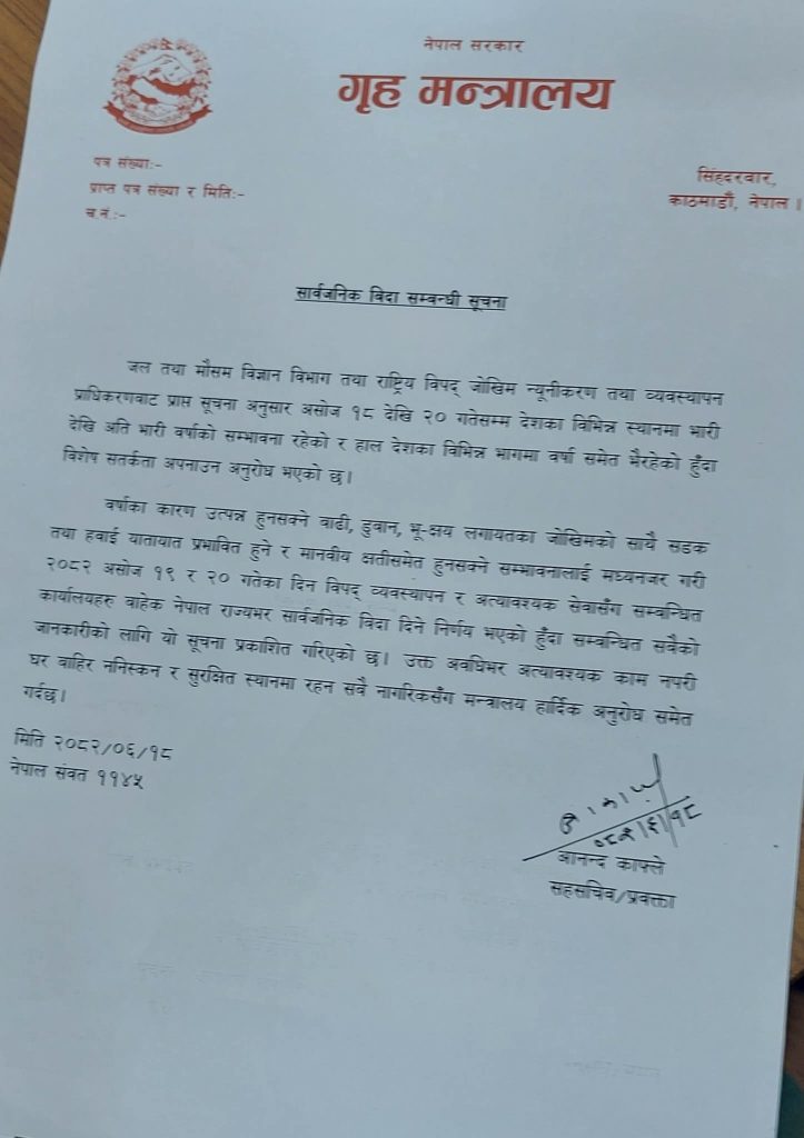 मन्त्रालयका प्रवक्ता तथा सहसचिव आनन्द काफ्लेले जारी गरेको सूचनामा भनिएको छ,“वर्षाको कारणबाट उत्पन्न हुनसक्ने बाढी, डुबान, भूक्षय र सडक यातायात अवरोधका सम्भावनालाई मध्यनजर गर्दै असोज १९ र २० गते सार्वजनिक बिदा दिने निर्णय गरिएको हो।”