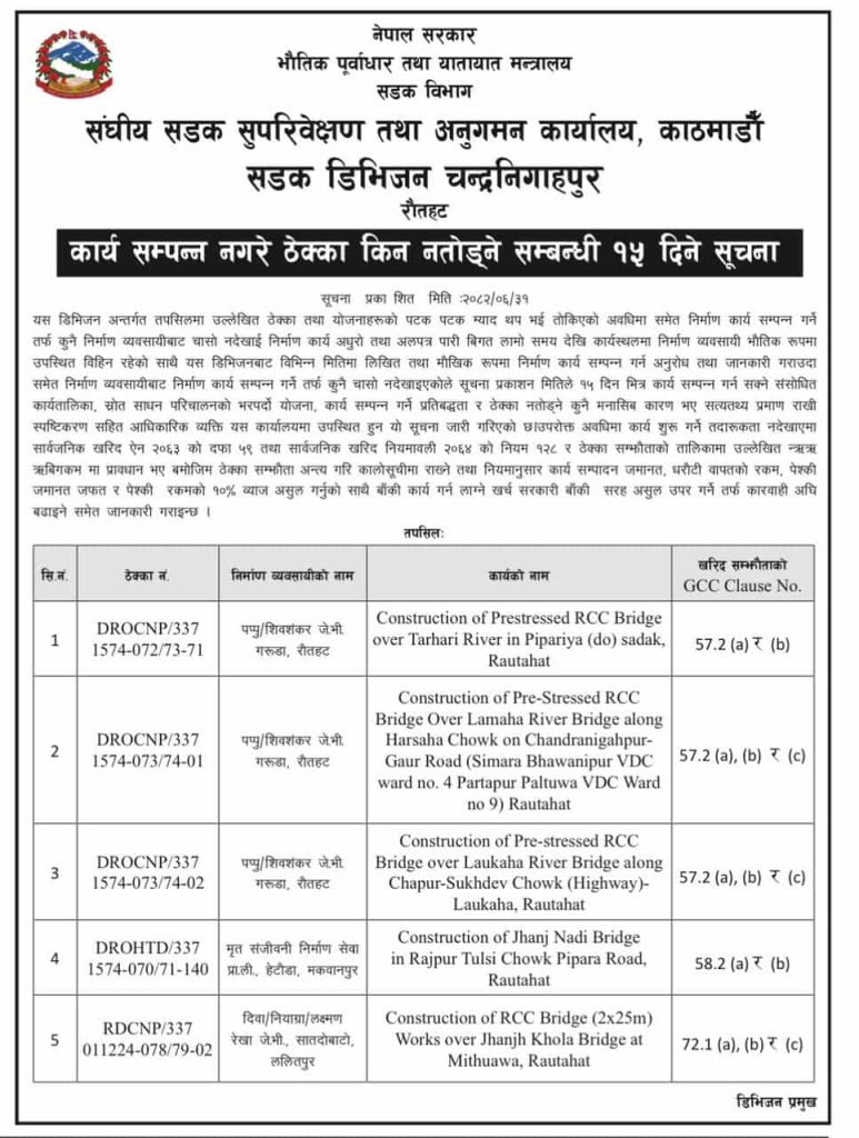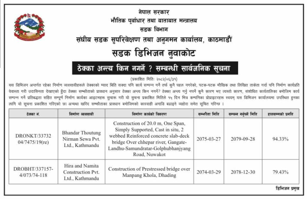 सडक डिभिजन कार्यालय विराटनगर, चन्द्रनिगाहपुर तथा निर्देशनालयले पाँच/पाँच र नुवाकोटले २ वटा गरी १७ वटा ठेक्का किन नतोड्ने ? भन्दै शुक्रबार सार्वजनिक सूचना जारी गरेका छन् । ठेका तोड्न प्रक्रिया बढाइएका अधिकांश पुल निर्माणका रहेका छन् ।