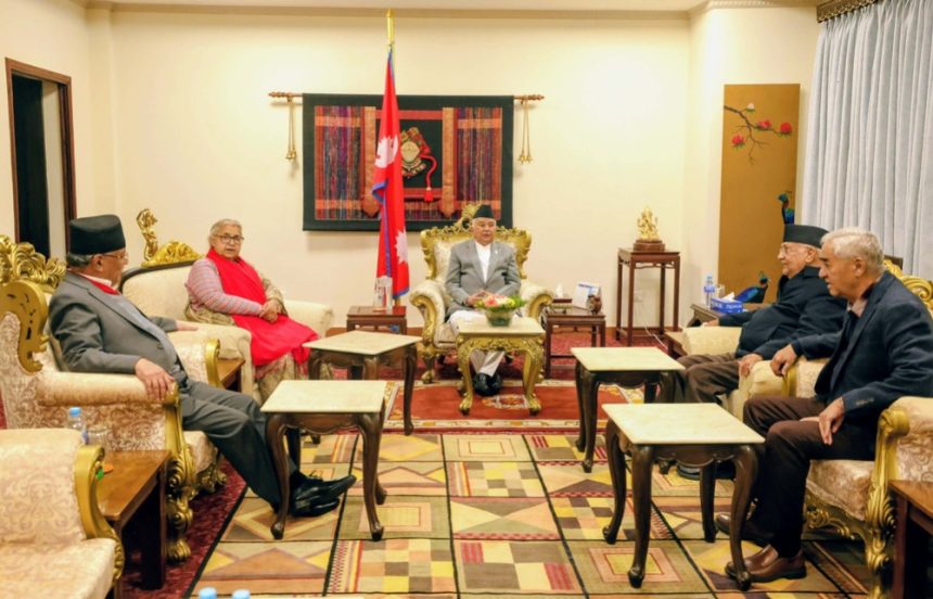 शीतल निवासमा राष्ट्रपति रामचन्द्र पौडेलको उपस्थितिमा कुराकानी भएको हो । राष्ट्रपति पौडेलले नै छलफल डाकेका हुन् । छलफलमा पूर्वप्रधानमन्त्रीसमेत रहेका तीन दलका शीर्ष नेताहरू शेरबहादुर देउवा, केपी शर्मा ओली र पुष्पकमल दाहाल सहभागी छन् ।
