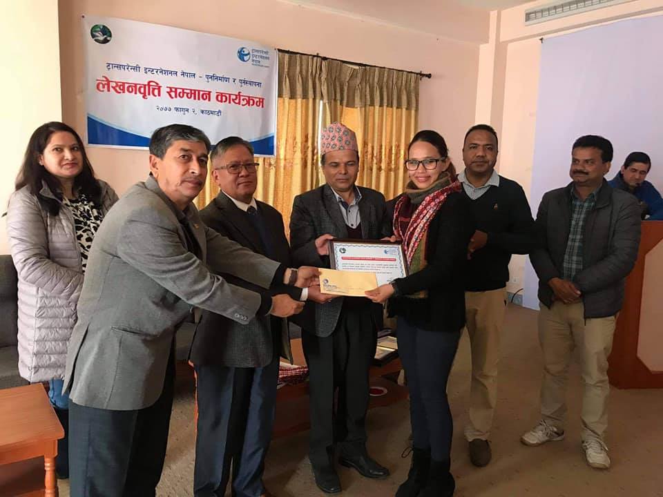 ट्रान्सपरेन्सी इन्टरनेशनल नेपाल– पुननिर्माण र पुर्नस्थापना लेखनवृत्तिबाट स्वतन्त्र पत्रकार पौडेलसहित १४ जना सम्मानित हुनुभएको छ ।