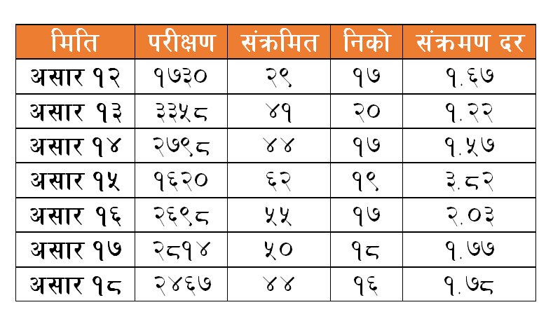 मन्त्रालयले तथ्यांकअनुसार असार १५ गते सर्वाधिक ६२ जनामा सङ्क्रमण पुष्टि भएको थियो । यो दिन सङ्क्रमण दर ३.८२ प्रतिशत पुगेको थियो । त्यस्तै १६ गते ५५ जनामा सङ्क्रमण पुष्टि हुँदा सङ्क्रमण दर २.०३ प्रतिशत रहेको थियो ।