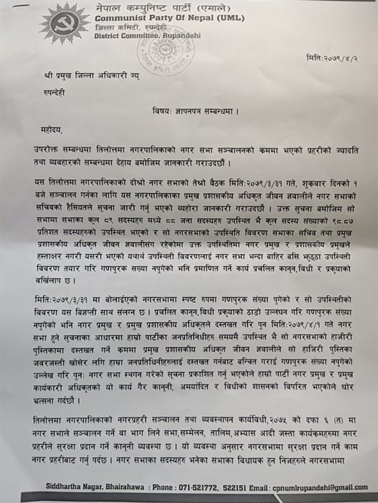 नेकपा एमाले रुपन्देहीले डीएसपी केसी र नगरपालिकाका प्रमुख प्रशासकीय अधिकृत जीवन ज्ञवालीलाई कारवाही गर्न प्रमुख जिल्ला अधिकारीसमक्ष माग गरेको छ ।
