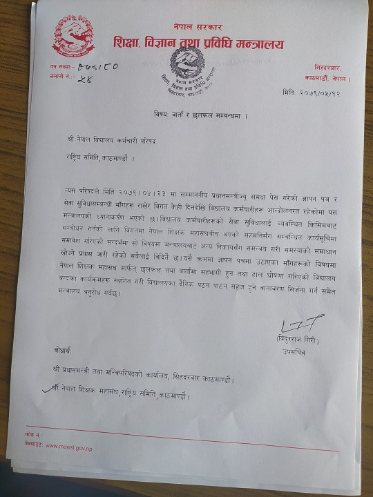कर्मचारीले उठाएका मागहरूका विषयमा वार्ता र छलफल गरिने भन्दै शिक्षा मन्त्रालयले प्रधानमन्त्री तथा मन्त्रिपरिषद्को कार्यालय र नेपाल शिक्षक महासंघ राष्ट्रिय समितिलाई पत्र पठाएकाे छ ।