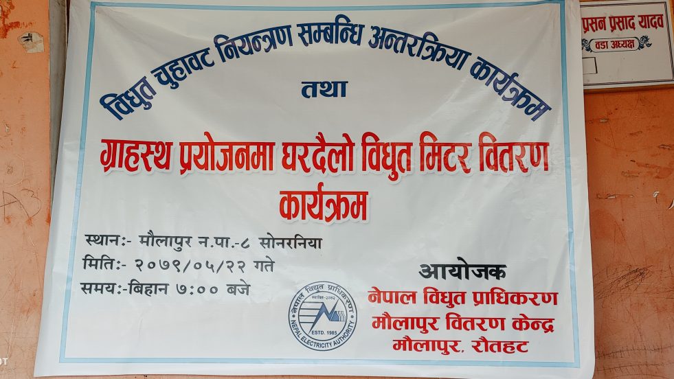 नेपाल विधुत प्राधिकरण मौलापुर वितरण केन्द्रको आयोजनामा विधुत चुहावट नियन्त्रण सम्बन्धी अन्तरक्रिया कार्यक्रम एवं ग्राहस्थ प्रयोजनामा घरदैलो विधुत मिटर वितरण कार्यक्रम आज बुधबार मौलापुर नगरपालिका अन्तर्गत वडा ८ सोनरनियाँमा सम्पन भएको छ । नेपाल विद्युत प्राधिकरण वितरण केन्द्र मौलापुर शाखाले विद्युत चुहावट नियन्त्रण गर्नका लागि वडा ८ सोनरनियाँका ग्राहकहरुलाई विधुत मिटर वितरण गरिएको छ । स्थानीय बलकेशिया देवी, शियापति देवी , मरछिया देवी र हिरमतिया देवी लगायत २५ जाना ग्राहकहरुलाई मौलापुर ८ वाडा कार्यलयको प्रागनमा वाडाध्यक्ष शिवप्रशन यादवको उपस्तिथिमा वितरण कार्यक्रम सम्पन्न भएको नेपाल विधुत प्राधिकरण मौलापुर वितरण केन्द्रका कार्यलय प्रमुख संदिप दासले बताए ।