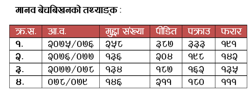 २०७५ साउनपछि ८८१ जनालाई पक्राउ गरिएको मानव बेचबिखन ब्यूरोका प्रवक्ता (एसपी) दानबहादुर मल्लले बताए । उनले भने, ‘मानव बेचबिखनबारे ६७३ वटा मुद्दा दर्ता गरेर अनुसन्धान गरिरहेका छौं ।’