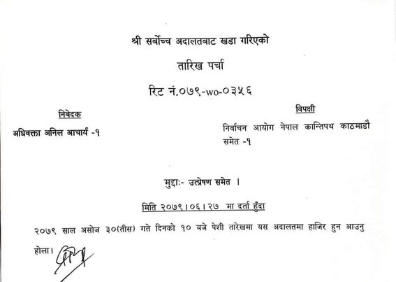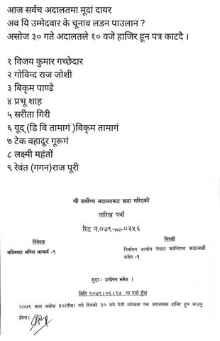 सर्वोच्च प्रशसनका अनुसार उक्त रिट निवेदन दर्ता भएको छ । उक्त रिटको पेशी असोज ३० गतेका लागि तोकिएको छ । अधिवक्ता आर्चायका अनुसार निर्वाचन आयोय, प्रधानमन्त्री तथा मन्त्रिपरिषद्को कार्यालय, कानुन न्याय तथा संसदीय मामिला मन्त्रालय, प्रतिनिधि सभा सदस्य उम्मेदवार विजयकुमार गच्छदार, गोविन्दराज जोशी, विक्रम पाण्डे, प्रभु साह, सरिता गिरी, टेकबहादुर गुरूङ, लक्ष्मी महतोलाई विपक्षी बनाइएको छ । यस्तै, प्रदेश सभातर्फका उम्मेदवार डीबी तामाङ भनिने युद्धविक्रम तामाङ र गगन नामले चिनिने रेवतराज पुरीलाई पनि विपक्षी बनाइएको छ ।