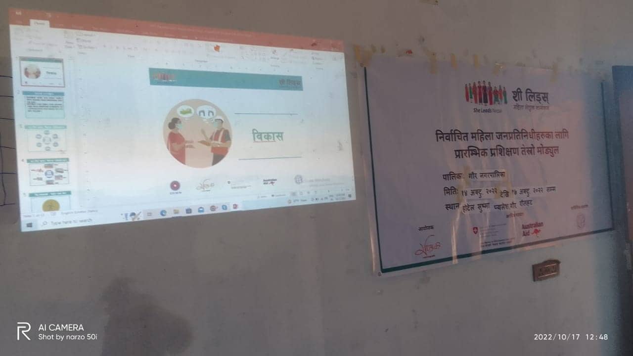 स्वीस सरकार विकास सहयोग एस.डी.सी. तथा अष्ट्रेलियन एड को आर्थिक सहयोग तथा IFES नेपालको प्राविधिक सहयोग र माण्डवी रौतहटको आयोजनामा संचालित शी लिडस परियोजना अन्तर्गत गौर नगरपालिकाका निर्वाचित महिला जनप्रतिनिधिहरुलाई नेतृत्व क्षमता, सीपको विकास सम्बन्धि ४ दिने तालिम सोमबार समपन्न भएको हो । तालिम असोज २७ गते देखि ३१असोज सम्म चलेको थियो । स्थानीय सरकारमा प्रभावकारी ढंगले आफनो भुमिका निर्वाह गर्नका लागि निर्वाचित महिला जनप्रतिनिधिहरुलाई चाहिने सीप र ज्ञान प्रदान गर्ने, आत्मविश्वास बढाउन,लैङ्गिक सामानता प्रवद्धन तथा लैङ्गिक सामानतालाई संरक्षण गर्ने उदेश्यले ४ दिने तेस्रो मोड्युलको तालिम सँचालन गरिएको परियोजनाको अनुगमन तथा मुल्याँकन अधिकृत सुविन्द्र कुमार दासले जानकारी गराउनु भयो ।