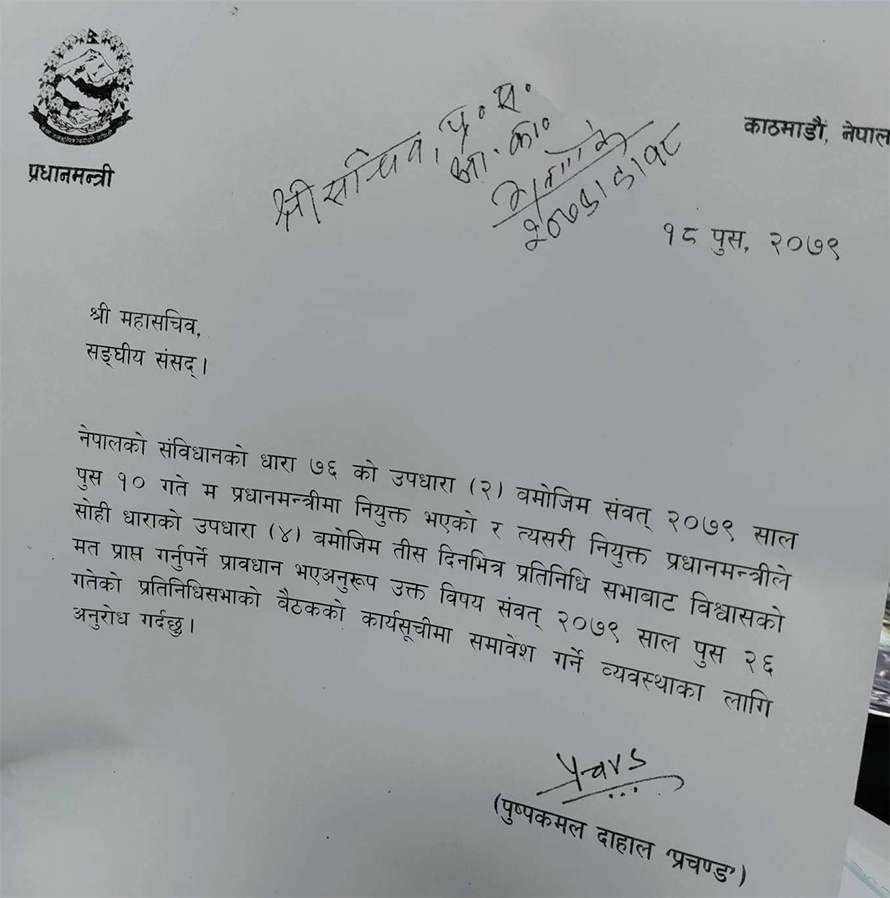संघीय संसद सचिवालयका महासचिवलाई सोमबार पत्र पठाउँदै प्रचण्डले पुस २६ गतेको बैठकमा विश्वासको मत लिने व्यवस्था मिलाउन आग्रह गरेका हुन्।
