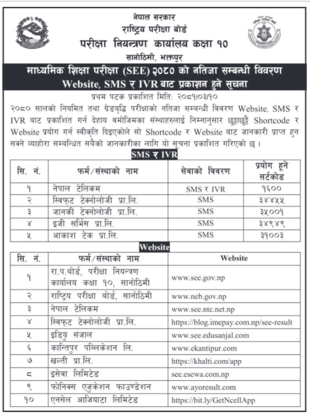 नतिजा हेर्नका लागि विभिन्न माध्यमको व्यवस्था गरिएको छ । वेबसाइट, एसएमएस र आइभीआरबाट नतिजा हेर्न सकिने बोर्डले जनाएको छ । बोर्डले तत्कालै रिजल्ट थाह पाउन निम्न अनुसार व्यवस्था गरेको छ ।