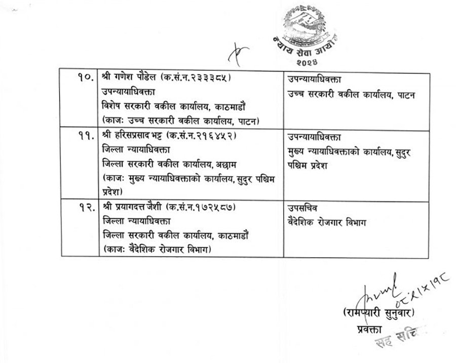 काठमाडौं, १९ भदौ। न्याय सेवाका १७ सहसचिव र १३ उपसचिवको सरुवा भएको छ ।